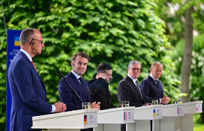 Emmanuel Macron, Friedrich Merz, Keir Starmer, Donald Tusk et Voloydmyr Zelensky donnent une conférence de presse à l'issue de la Coalition des Volontaires à Kiev, le 10 mai 2025. Cette conférence de la Coalition des Volontaires a pour objectif de soutenir l'Ukraine et à contribuer à assurer l'avenir de l'Europe et de l'Ukraine. Le but recherché était l'instauration d'un cessez-le-feu de 30 jours pour soutenir les négociations de paix avec la Russie. © Christian Liewig / Bestimage Emmanuel Macron, Friedrich Merz, Keir Starmer, Donald Tusk, and Voloydmyr Zelensky give a press conference following the Coalition of the Willing in Kyiv on May 10, 2025. The conference aims to support Ukraine and help secure the future of Europe and Ukraine. The goal was to establish a 30-day ceasefire to advance peace negotiations with Russia.