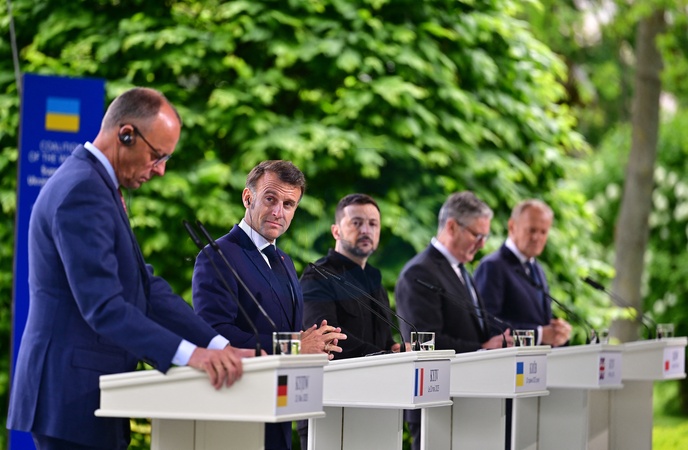 Emmanuel Macron, Friedrich Merz, Keir Starmer, Donald Tusk i Wołodymyr Zełenski na konferencji prasowej po Koalicji Chętnych w Kijowie