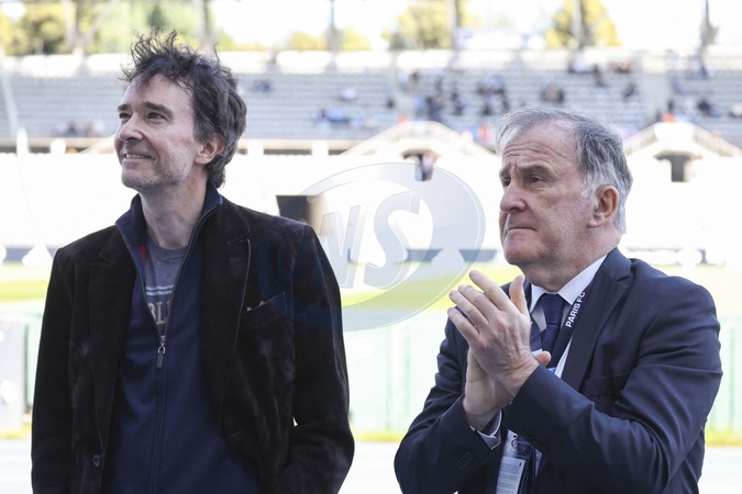 Antoine Arnault - Pierre Ferracci (Paris FC) - Célébrités lors du match de football entre le Paris FC face à l'AC Ajaccio (2-0) au stade Charlety à Paris le 10 mai 2025. Celebrities during the football match between Paris FC against AC Ajaccio (2-0) at the Charlety stadium in Paris on May 10, 2025.