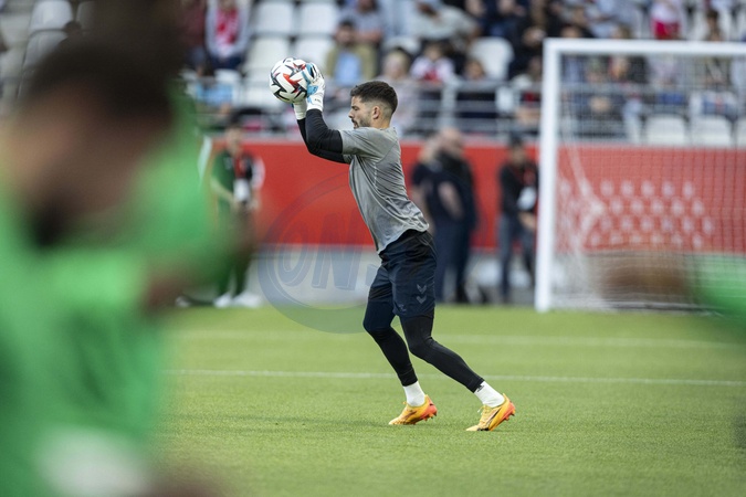 LARSONNEUR GAUTIER 30 Echauffement des joueurs de Saint Etienne - Match de Ligue 1 McDonalds, Reims FC contre Saint-Etienne (0-2) à Reims le 10 mai 2025. Ligue 1 McDonalds match, Reims FC against Saint-Etienne (0-2) in Reims on May 10, 2025.