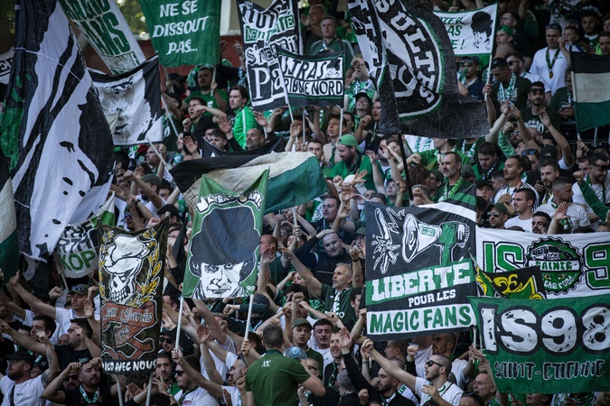 Supporters Saint Etienne – ambiance - Match de Ligue 1 McDonalds, Reims FC contre Saint-Etienne (0-2) à Reims le 10 mai 2025. Ligue 1 McDonalds match, Reims FC against Saint-Etienne (0-2) in Reims on May 10, 2025.