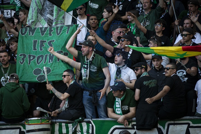Supporters Saint Etienne – ambiance - Match de Ligue 1 McDonalds, Reims FC contre Saint-Etienne (0-2) à Reims le 10 mai 2025. Ligue 1 McDonalds match, Reims FC against Saint-Etienne (0-2) in Reims on May 10, 2025.