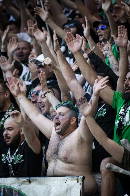Supporters Saint Etienne – ambiance - Match de Ligue 1 McDonalds, Reims FC contre Saint-Etienne (0-2) à Reims le 10 mai 2025. Ligue 1 McDonalds match, Reims FC against Saint-Etienne (0-2) in Reims on May 10, 2025.