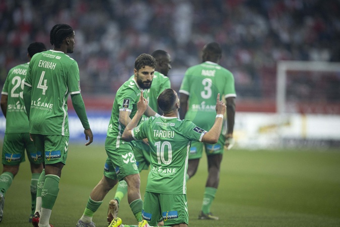 Joie des joueurs de Saint Etienne apres le but de TARDIEU FLORIAN 10 - Match de Ligue 1 McDonalds, Reims FC contre Saint-Etienne (0-2) à Reims le 10 mai 2025. Ligue 1 McDonalds match, Reims FC against Saint-Etienne (0-2) in Reims on May 10, 2025.