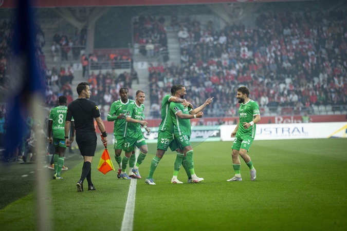 Joie des joueurs de Saint Etienne apres le but de TARDIEU FLORIAN 10 - Match de Ligue 1 McDonalds, Reims FC contre Saint-Etienne (0-2) à Reims le 10 mai 2025. Ligue 1 McDonalds match, Reims FC against Saint-Etienne (0-2) in Reims on May 10, 2025.