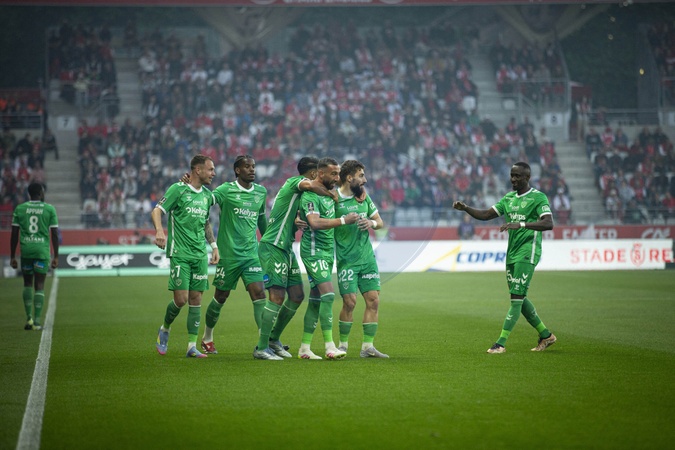 Joie des joueurs de Saint Etienne apres le but de TARDIEU FLORIAN 10 - Match de Ligue 1 McDonalds, Reims FC contre Saint-Etienne (0-2) à Reims le 10 mai 2025. Ligue 1 McDonalds match, Reims FC against Saint-Etienne (0-2) in Reims on May 10, 2025.
