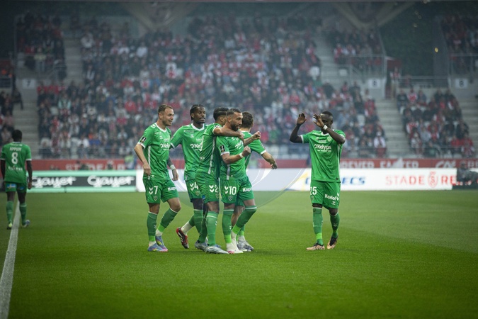 Joie des joueurs de Saint Etienne apres le but de TARDIEU FLORIAN 10 - Match de Ligue 1 McDonalds, Reims FC contre Saint-Etienne (0-2) à Reims le 10 mai 2025. Ligue 1 McDonalds match, Reims FC against Saint-Etienne (0-2) in Reims on May 10, 2025.