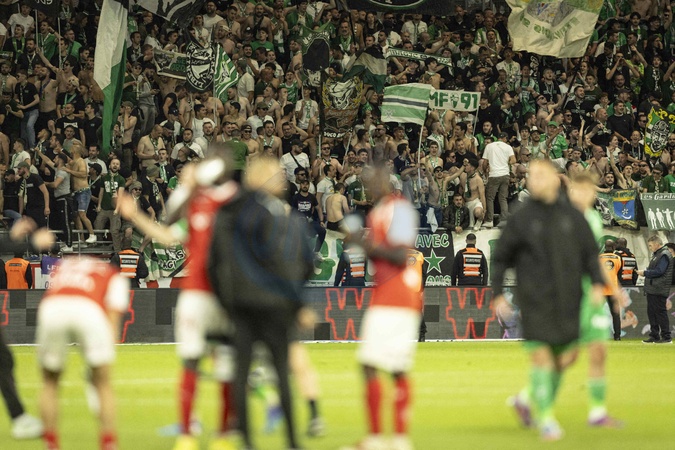Joie des joueurs de Saint Etienne apres leur victoire - Match de Ligue 1 McDonalds, Reims FC contre Saint-Etienne (0-2) à Reims le 10 mai 2025. Ligue 1 McDonalds match, Reims FC against Saint-Etienne (0-2) in Reims on May 10, 2025.