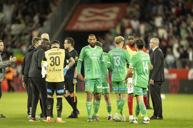 Joie des joueurs de Saint Etienne apres leur victoire - Match de Ligue 1 McDonalds, Reims FC contre Saint-Etienne (0-2) à Reims le 10 mai 2025. Ligue 1 McDonalds match, Reims FC against Saint-Etienne (0-2) in Reims on May 10, 2025.