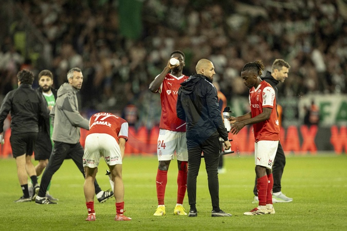 déception des joueurs de Reims après leur défaite - Match de Ligue 1 McDonalds, Reims FC contre Saint-Etienne (0-2) à Reims le 10 mai 2025. Ligue 1 McDonalds match, Reims FC against Saint-Etienne (0-2) in Reims on May 10, 2025.