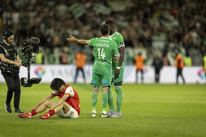 déception des joueurs de Reims après leur défaite - Match de Ligue 1 McDonalds, Reims FC contre Saint-Etienne (0-2) à Reims le 10 mai 2025. Ligue 1 McDonalds match, Reims FC against Saint-Etienne (0-2) in Reims on May 10, 2025.