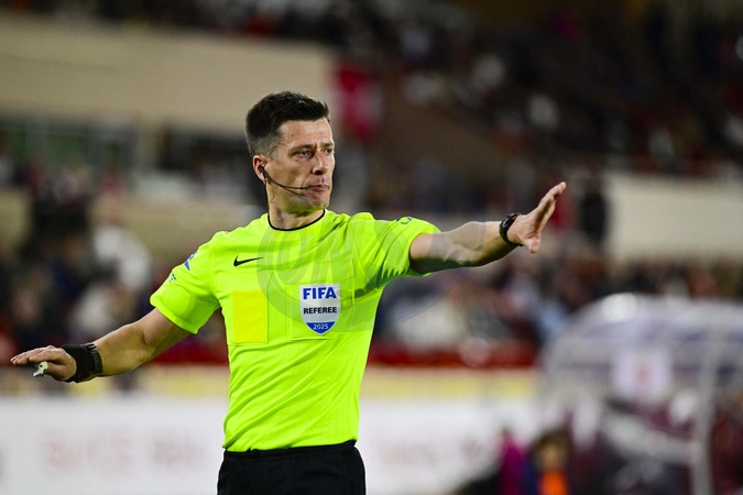 L'AS Monaco affronte l'Olympique Lyonnais dans le cadre de la 33e journée de Ligue 1 Mcdonald's. Benoît Bastien, arbitre principal de la rencontre. Ligue 1 McDonalds match, AS Monaco against Olympique Lyonnais (2-0) in Monaco on may 10, 2025.