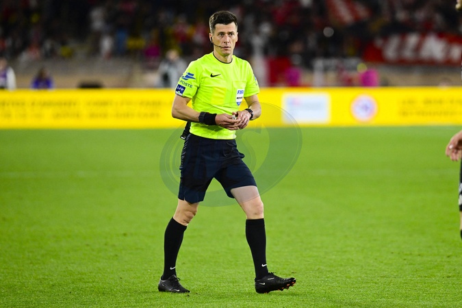 L'AS Monaco affronte l'Olympique Lyonnais dans le cadre de la 33e journée de Ligue 1 Mcdonald's. Benoît Bastien, arbitre principal de la rencontre. Ligue 1 McDonalds match, AS Monaco against Olympique Lyonnais (2-0) in Monaco on may 10, 2025.