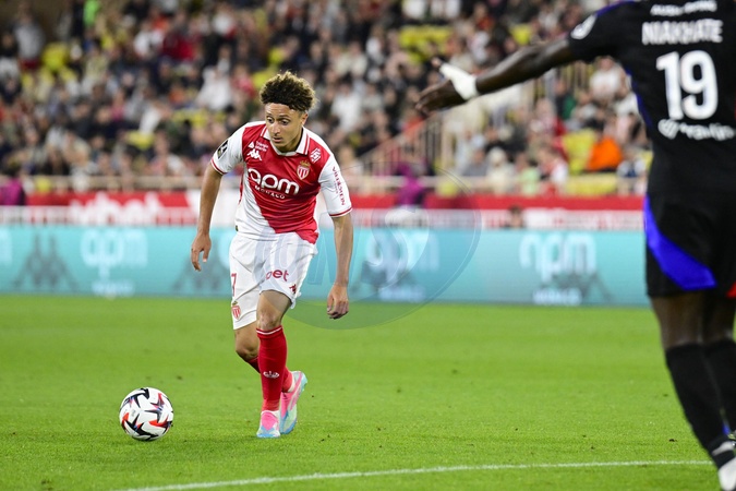 L'AS Monaco affronte l'Olympique Lyonnais dans le cadre de la 33e journée de Ligue 1 Mcdonald's. EliesseBen Seghir (ASM) Ligue 1 McDonalds match, AS Monaco against Olympique Lyonnais (2-0) in Monaco on may 10, 2025.