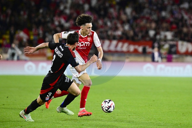 L'AS Monaco affronte l'Olympique Lyonnais dans le cadre de la 33e journée de Ligue 1 Mcdonald's. MaghnesAkliouche (ASM) Ligue 1 McDonalds match, AS Monaco against Olympique Lyonnais (2-0) in Monaco on may 10, 2025.