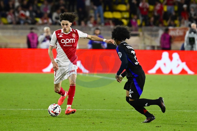 L'AS Monaco affronte l'Olympique Lyonnais dans le cadre de la 33e journée de Ligue 1 Mcdonald's. MaghnesAkliouche (ASM) Ligue 1 McDonalds match, AS Monaco against Olympique Lyonnais (2-0) in Monaco on may 10, 2025.