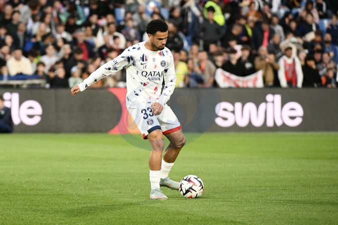 Warren ZAIRE-EMERY (PSG) lors de l'échauffement pour le match Montpellier Herault SC vs. Paris Saint-Germain pour la 33eme journee de la Ligue 1 McDonald's au Stade de la Mosson, le 10 mai 2025. Ligue 1 McDonald's match, Montpellier Herault SC vs. Paris Saint-Germain (1-4) in Montpellier on May 10, 2025.