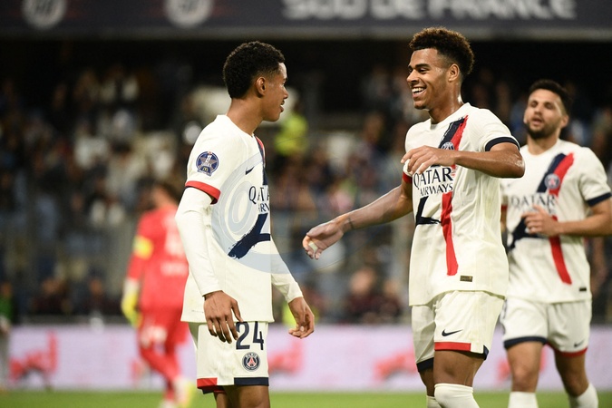 Celebration But de Senny MAYULU (PSG) Desire DOUE (PSG) lors du match Montpellier Herault SC vs. Paris Saint-Germain pour la 33eme journee de la Ligue 1 McDonald's au Stade de la Mosson, le 10 mai 2025. Ligue 1 McDonald's match, Montpellier Herault SC vs. Paris Saint-Germain (1-4) in Montpellier on May 10, 2025.