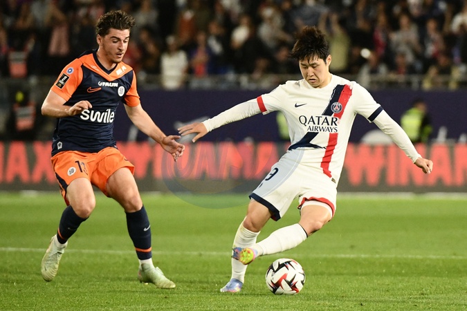 Joris CHOTARD (MHSC), Kang-In LEE (PSG) lors du match Montpellier Herault SC vs. Paris Saint-Germain pour la 33eme journee de la Ligue 1 McDonald's au Stade de la Mosson, le 10 mai 2025. Ligue 1 McDonald's match, Montpellier Herault SC vs. Paris Saint-Germain (1-4) in Montpellier on May 10, 2025.