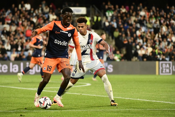 Rabby NZINGOULA (MHSC), Desire DOUE (PSG) lors du match Montpellier Herault SC vs. Paris Saint-Germain pour la 33eme journee de la Ligue 1 McDonald's au Stade de la Mosson, le 10 mai 2025. Ligue 1 McDonald's match, Montpellier Herault SC vs. Paris Saint-Germain (1-4) in Montpellier on May 10, 2025.