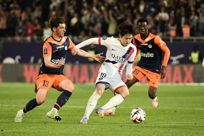 Joris CHOTARD (MHSC), Kang-In LEE (PSG), Rabby NZINGOULA (MHSC) lors du match Montpellier Herault SC vs. Paris Saint-Germain pour la 33eme journee de la Ligue 1 McDonald's au Stade de la Mosson, le 10 mai 2025. Ligue 1 McDonald's match, Montpellier Herault SC vs. Paris Saint-Germain (1-4) in Montpellier on May 10, 2025.