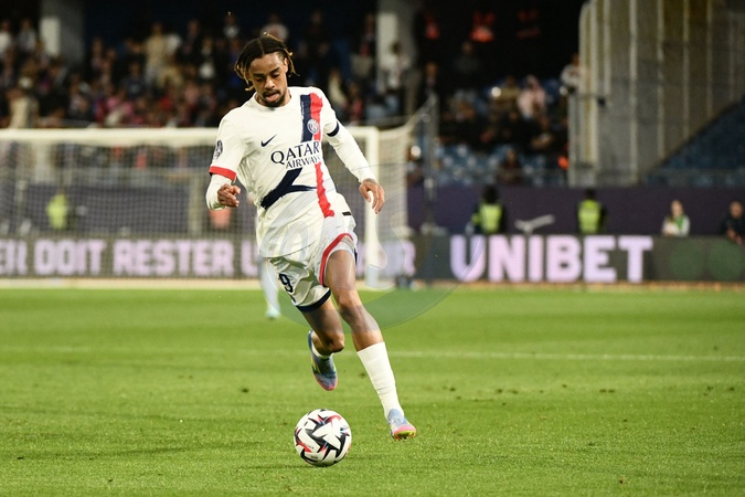 Bradley BRACOLA (PSG) lors du match Montpellier Herault SC vs. Paris Saint-Germain pour la 33eme journee de la Ligue 1 McDonald's au Stade de la Mosson, le 10 mai 2025. Ligue 1 McDonald's match, Montpellier Herault SC vs. Paris Saint-Germain (1-4) in Montpellier on May 10, 2025.