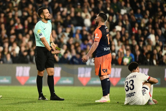 Carton jaune Jordan FERRI (MHSC) lors du match Montpellier Herault SC vs. Paris Saint-Germain pour la 33eme journee de la Ligue 1 McDonald's au Stade de la Mosson, le 10 mai 2025. Ligue 1 McDonald's match, Montpellier Herault SC vs. Paris Saint-Germain (1-4) in Montpellier on May 10, 2025.