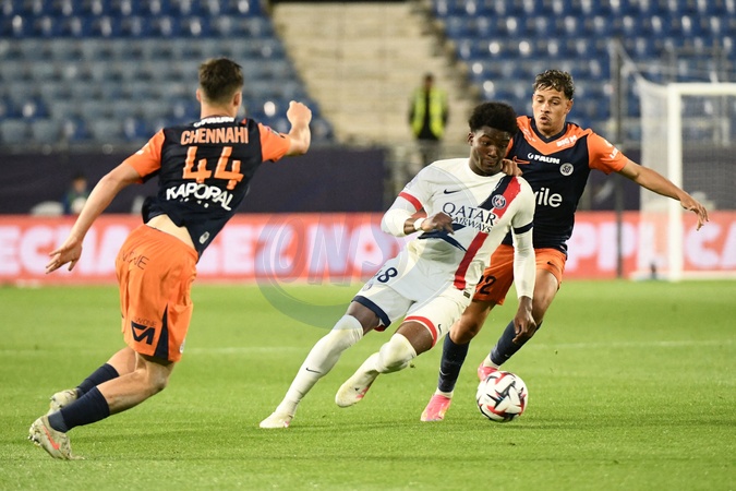 Axel TAPE (PSG) lors du match Montpellier Herault SC vs. Paris Saint-Germain pour la 33eme journee de la Ligue 1 McDonald's au Stade de la Mosson, le 10 mai 2025. Ligue 1 McDonald's match, Montpellier Herault SC vs. Paris Saint-Germain (1-4) in Montpellier on May 10, 2025.