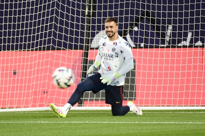 Arnau TENAS (PSG) lors de l'échauffement pour le match Montpellier Herault SC vs. Paris Saint-Germain pour la 33eme journee de la Ligue 1 McDonald's au Stade de la Mosson, le 10 mai 2025. Ligue 1 McDonald's match, Montpellier Herault SC vs. Paris Saint-Germain (1-4) in Montpellier on May 10, 2025.