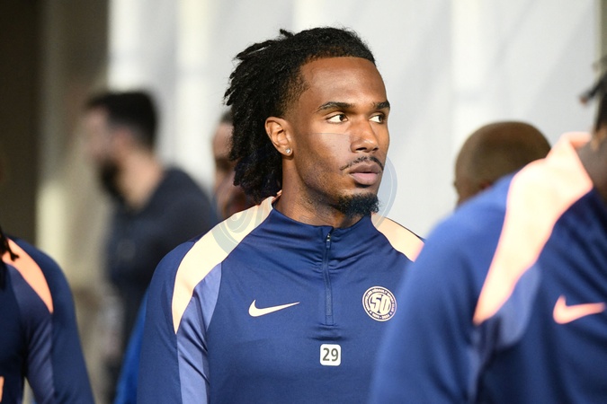 Enzo TCHATO MBIAYI (MHSC) lors de l'échauffement pour le match Montpellier Herault SC vs. Paris Saint-Germain pour la 33eme journee de la Ligue 1 McDonald's au Stade de la Mosson, le 10 mai 2025. Ligue 1 McDonald's match, Montpellier Herault SC vs. Paris Saint-Germain (1-4) in Montpellier on May 10, 2025.