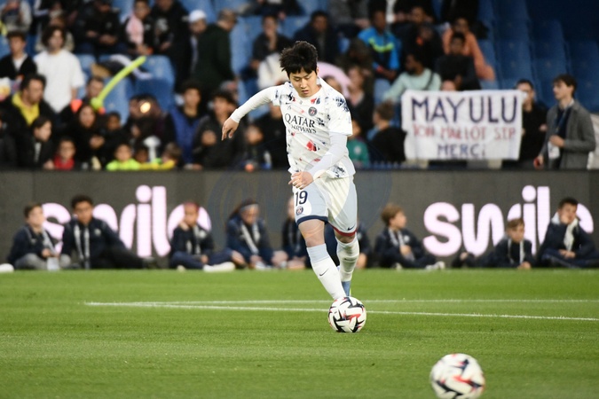 Kang-In LEE (PSG) lors de l'échauffement pour le match Montpellier Herault SC vs. Paris Saint-Germain pour la 33eme journee de la Ligue 1 McDonald's au Stade de la Mosson, le 10 mai 2025. Ligue 1 McDonald's match, Montpellier Herault SC vs. Paris Saint-Germain (1-4) in Montpellier on May 10, 2025.
