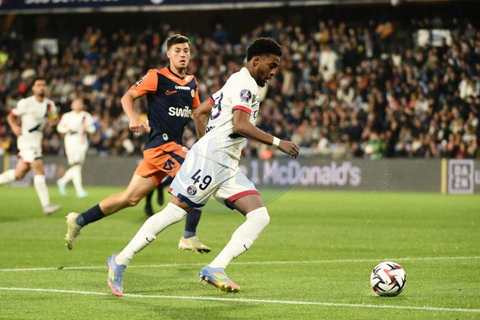 Ibrahim MBAYE (PSG) lors du match Montpellier Herault SC vs. Paris Saint-Germain pour la 33eme journee de la Ligue 1 McDonald's au Stade de la Mosson, le 10 mai 2025. Ligue 1 McDonald's match, Montpellier Herault SC vs. Paris Saint-Germain (1-4) in Montpellier on May 10, 2025.