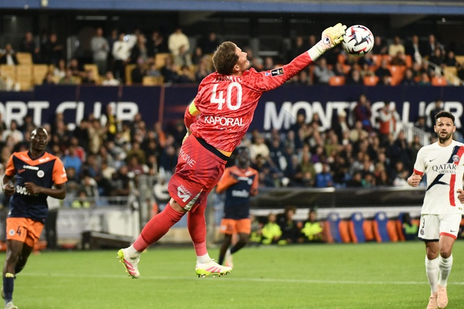 Arret Benjamin LECOMTE (MHSC) lors du match Montpellier Herault SC vs. Paris Saint-Germain pour la 33eme journee de la Ligue 1 McDonald's au Stade de la Mosson, le 10 mai 2025. Ligue 1 McDonald's match, Montpellier Herault SC vs. Paris Saint-Germain (1-4) in Montpellier on May 10, 2025.