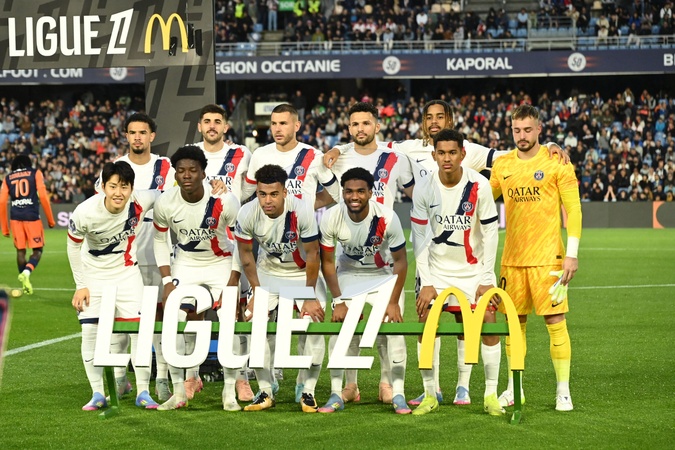 PSG lors de l'échauffement pour le match Montpellier Herault SC vs. Paris Saint-Germain pour la 33eme journee de la Ligue 1 McDonald's au Stade de la Mosson, le 10 mai 2025. Ligue 1 McDonald's match, Montpellier Herault SC vs. Paris Saint-Germain (1-4) in Montpellier on May 10, 2025.
