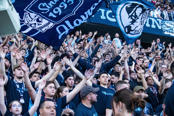 Supporters de l'AC Le Havre - Ambiance - Match de Ligue 1 McDonalds, AC Le Havre contre l'Olympique de Marseille (1-3) au Havre le 10 mai 2025. Ligue 1 McDonalds match, AC Le Havre against Olympique de Marseille (1-3) in Le Havre on May 10, 2025.
