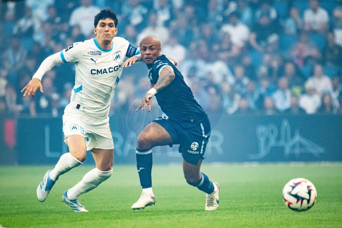 Leonardo Balerdi (OM) Andre Ayew (AC Le Havre) - Match de Ligue 1 McDonalds, AC Le Havre contre l'Olympique de Marseille (1-3) au Havre le 10 mai 2025. Ligue 1 McDonalds match, AC Le Havre against Olympique de Marseille (1-3) in Le Havre on May 10, 2025.