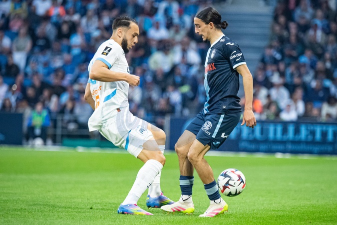 Amine Gouiri (OM) Yassine Kechta (AC Le Havre) - Match de Ligue 1 McDonalds, AC Le Havre contre l'Olympique de Marseille (1-3) au Havre le 10 mai 2025. Ligue 1 McDonalds match, AC Le Havre against Olympique de Marseille (1-3) in Le Havre on May 10, 2025.