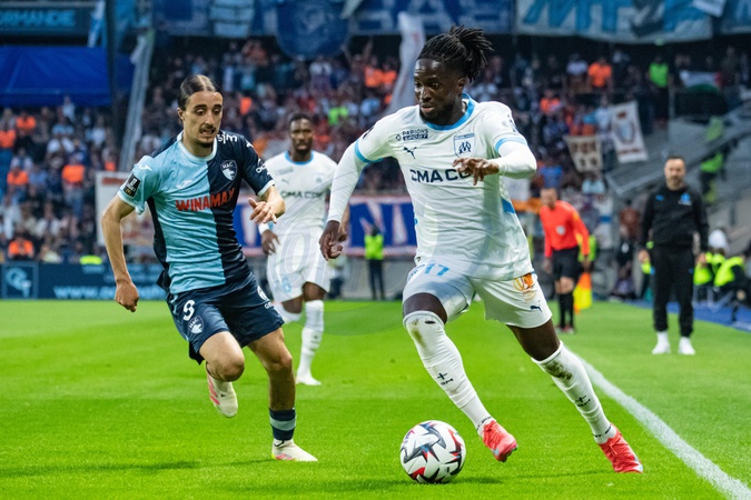 Jonathan Rowe (OM) Yassine Kechta (AC Le Havre) - Match de Ligue 1 McDonalds, AC Le Havre contre l'Olympique de Marseille (1-3) au Havre le 10 mai 2025. Ligue 1 McDonalds match, AC Le Havre against Olympique de Marseille (1-3) in Le Havre on May 10, 2025.