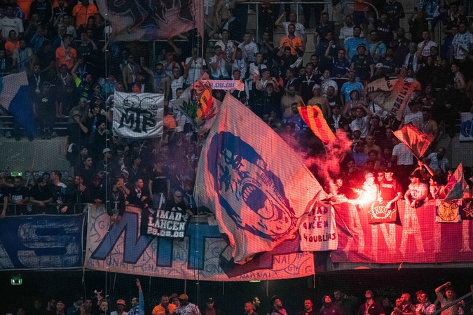 Supporters de l'OM - Ambiance - Match de Ligue 1 McDonalds, AC Le Havre contre l'Olympique de Marseille (1-3) au Havre le 10 mai 2025. Ligue 1 McDonalds match, AC Le Havre against Olympique de Marseille (1-3) in Le Havre on May 10, 2025.