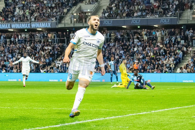 Joie des joueurs de l'OM aprés le but de Amine Gouiri (OM) - Match de Ligue 1 McDonalds, AC Le Havre contre l'Olympique de Marseille (1-3) au Havre le 10 mai 2025. Ligue 1 McDonalds match, AC Le Havre against Olympique de Marseille (1-3) in Le Havre on May 10, 2025.