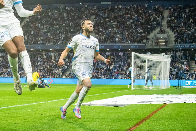 Joie des joueurs de l'OM aprés le but de Amine Gouiri (OM) - Match de Ligue 1 McDonalds, AC Le Havre contre l'Olympique de Marseille (1-3) au Havre le 10 mai 2025. Ligue 1 McDonalds match, AC Le Havre against Olympique de Marseille (1-3) in Le Havre on May 10, 2025.