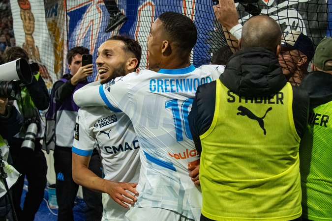 Joie des joueurs de l'OM aprés le but de Amine Gouiri (OM) - Match de Ligue 1 McDonalds, AC Le Havre contre l'Olympique de Marseille (1-3) au Havre le 10 mai 2025. Ligue 1 McDonalds match, AC Le Havre against Olympique de Marseille (1-3) in Le Havre on May 10, 2025.