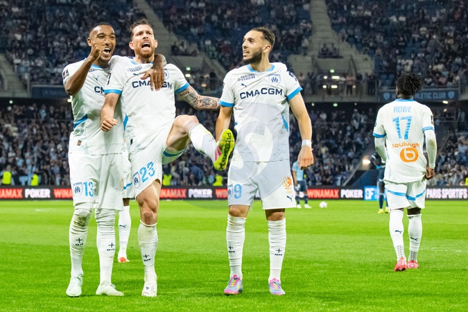 Joie des joueurs de l'OM aprés le but de Amine Gouiri (OM) - Match de Ligue 1 McDonalds, AC Le Havre contre l'Olympique de Marseille (1-3) au Havre le 10 mai 2025. Ligue 1 McDonalds match, AC Le Havre against Olympique de Marseille (1-3) in Le Havre on May 10, 2025.