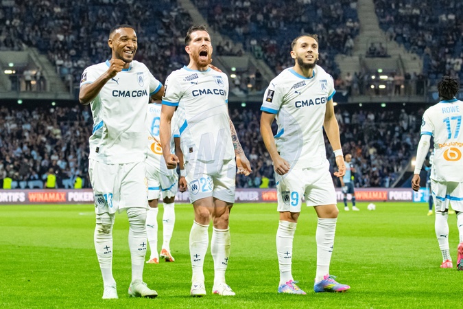Joie des joueurs de l'OM aprés le but de Amine Gouiri (OM) - Match de Ligue 1 McDonalds, AC Le Havre contre l'Olympique de Marseille (1-3) au Havre le 10 mai 2025. Ligue 1 McDonalds match, AC Le Havre against Olympique de Marseille (1-3) in Le Havre on May 10, 2025.