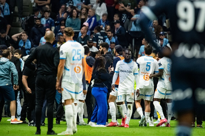 Interruption du match suite a des échauffourées dans les tribunes entre Havrais et Marseillais - Match de Ligue 1 McDonalds, AC Le Havre contre l'Olympique de Marseille (1-3) au Havre le 10 mai 2025. Ligue 1 McDonalds match, AC Le Havre against Olympique de Marseille (1-3) in Le Havre on May 10, 2025.