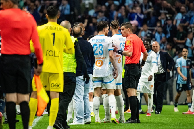 Interruption du match suite a des échauffourées dans les tribunes entre Havrais et Marseillais - Match de Ligue 1 McDonalds, AC Le Havre contre l'Olympique de Marseille (1-3) au Havre le 10 mai 2025. Ligue 1 McDonalds match, AC Le Havre against Olympique de Marseille (1-3) in Le Havre on May 10, 2025.