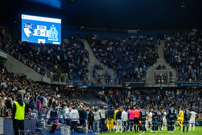 Interruption du match suite a des échauffourées dans les tribunes entre Havrais et Marseillais - Match de Ligue 1 McDonalds, AC Le Havre contre l'Olympique de Marseille (1-3) au Havre le 10 mai 2025. Ligue 1 McDonalds match, AC Le Havre against Olympique de Marseille (1-3) in Le Havre on May 10, 2025.