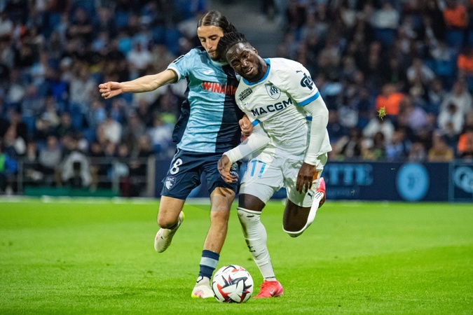 Jonathan Rowe (OM) Yassine Kechta (AC Le Havre) - Match de Ligue 1 McDonalds, AC Le Havre contre l'Olympique de Marseille (1-3) au Havre le 10 mai 2025. Ligue 1 McDonalds match, AC Le Havre against Olympique de Marseille (1-3) in Le Havre on May 10, 2025.