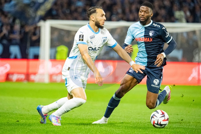 Amine Gouiri (OM) Josué Casimir (AC Le Havre) - Match de Ligue 1 McDonalds, AC Le Havre contre l'Olympique de Marseille (1-3) au Havre le 10 mai 2025. Ligue 1 McDonalds match, AC Le Havre against Olympique de Marseille (1-3) in Le Havre on May 10, 2025.