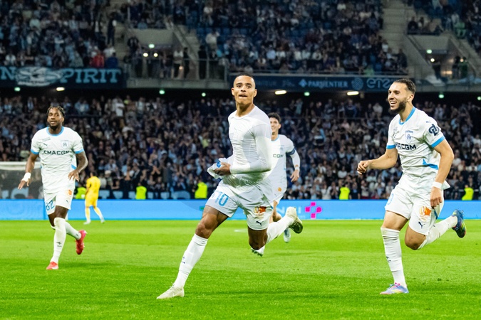 Joie des joueurs de l'OM aprés le but de Mason Greenwood (OM) - Match de Ligue 1 McDonalds, AC Le Havre contre l'Olympique de Marseille (1-3) au Havre le 10 mai 2025. Ligue 1 McDonalds match, AC Le Havre against Olympique de Marseille (1-3) in Le Havre on May 10, 2025.